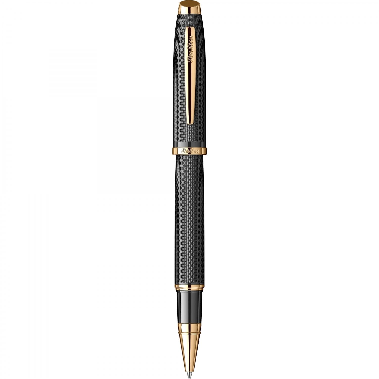 SCRIKSS Luxury Rollerball Pen with Textured Black Metal Body and Gold Trim Accents