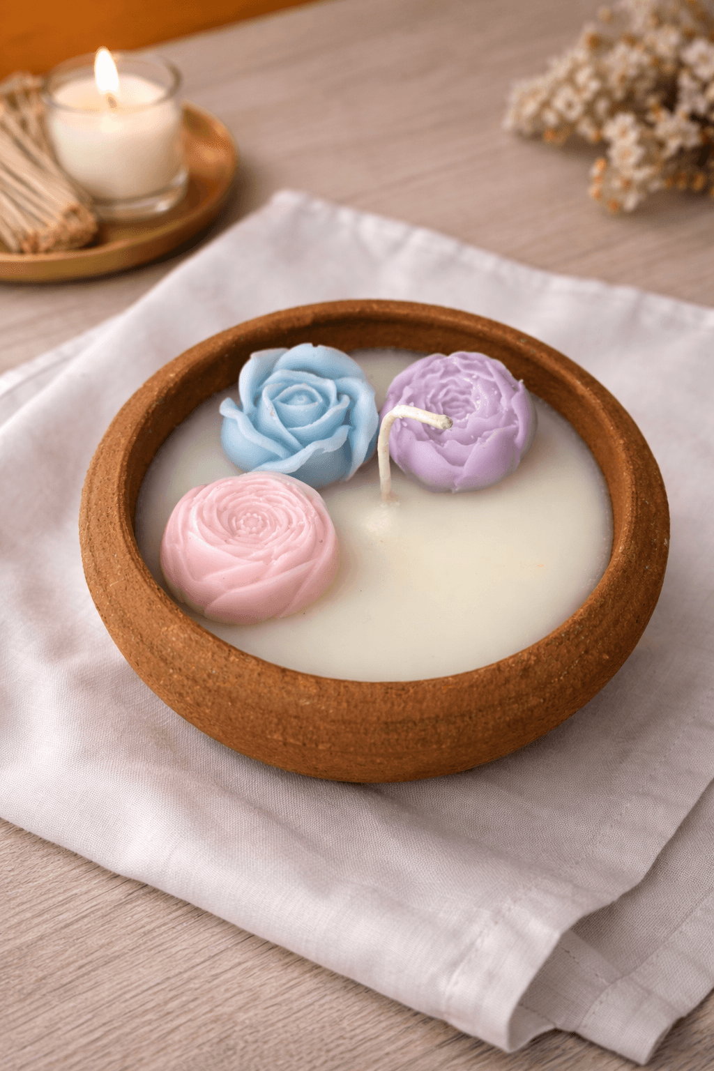 Bring calm, warmth, and artisanal charm into your space with the Terracotta Candle with Roses, a beautifully handmade soy wax candle designed to elevate everyday moments. Crafted in a natural terracotta bowl, this candle blends earthy aesthetics with soothing aromatherapy, making it a perfect décor accent and relaxation essential.