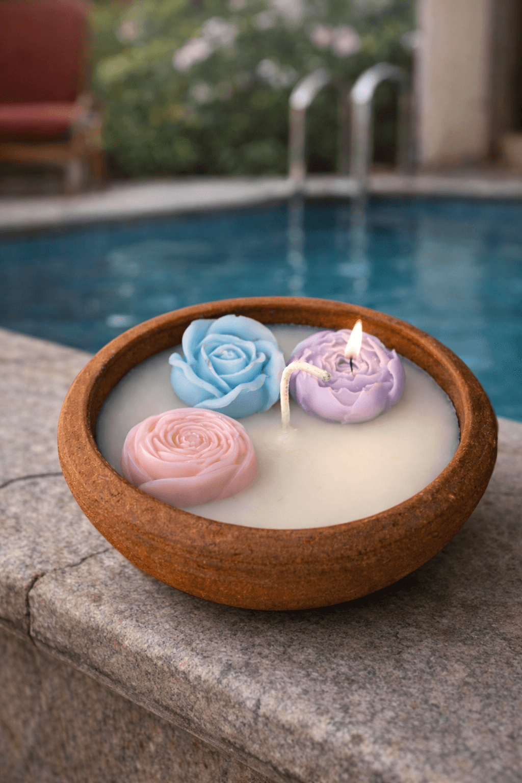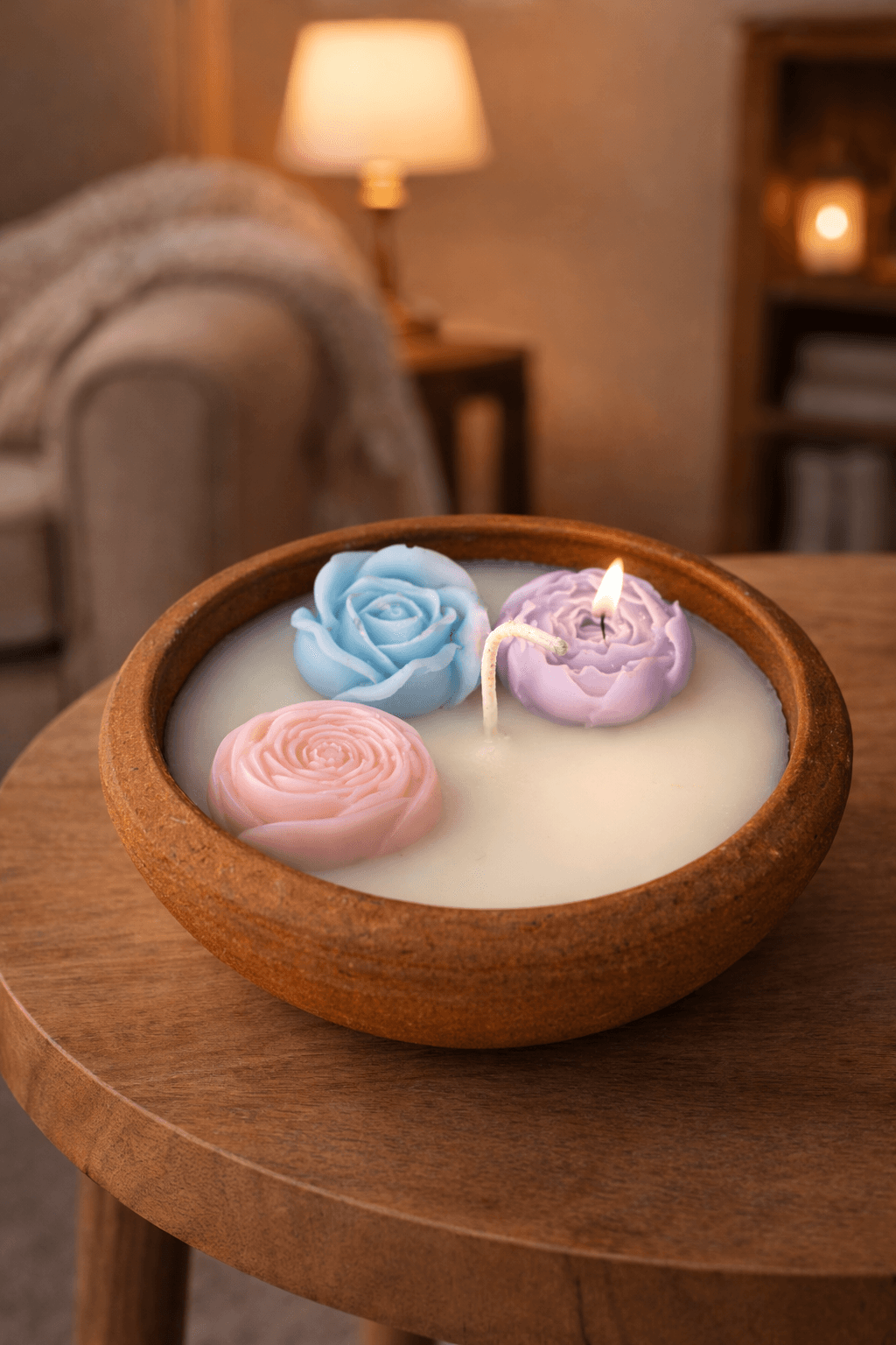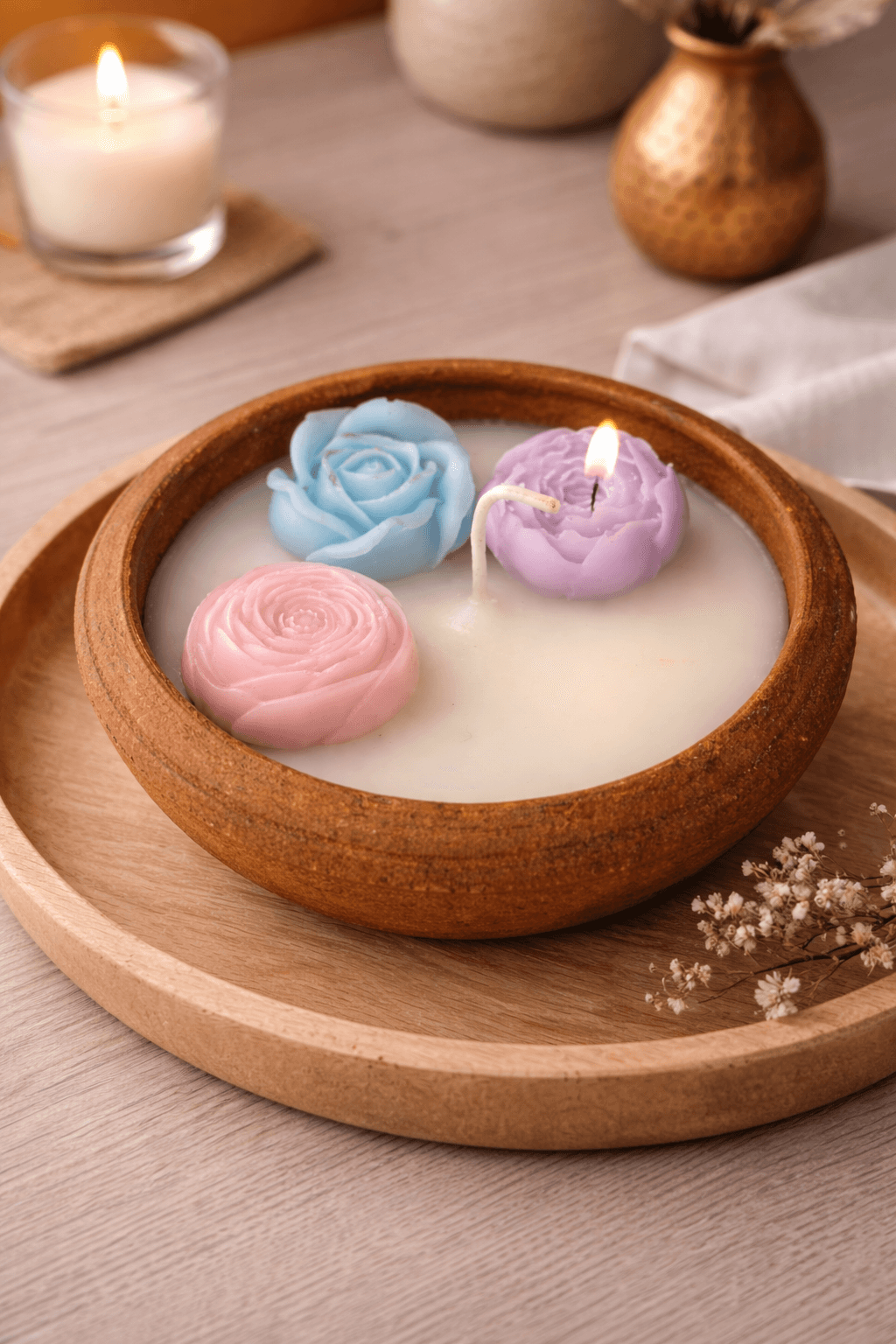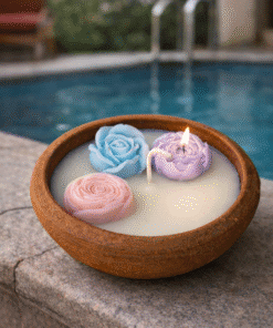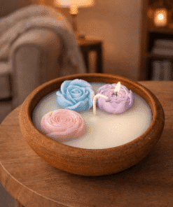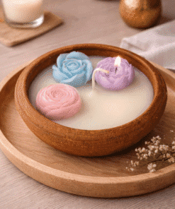 The candle features delicately sculpted rose-shaped wax elements, floating gracefully on smooth soy wax. Infused with a fragrance of your choice, it releases a soft, calming aroma known for reducing stress, promoting relaxation, and improving sleep quality.